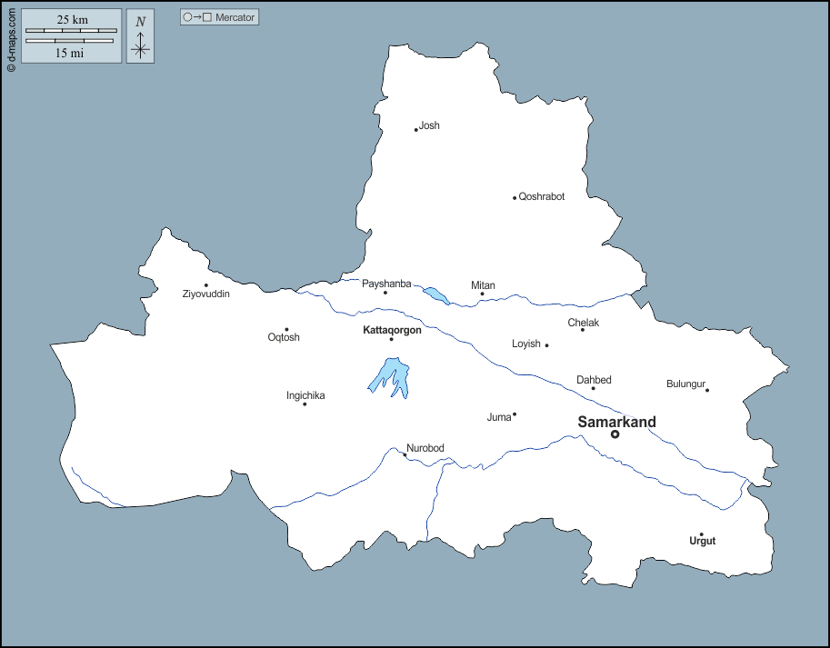 d-maps > एशिया > उज़्बेकिस्तान > समरक़न्द प्रान्त > बाह्यरेखा, जल-सर्वेक्षण, मुख्य शहरों, नाम
