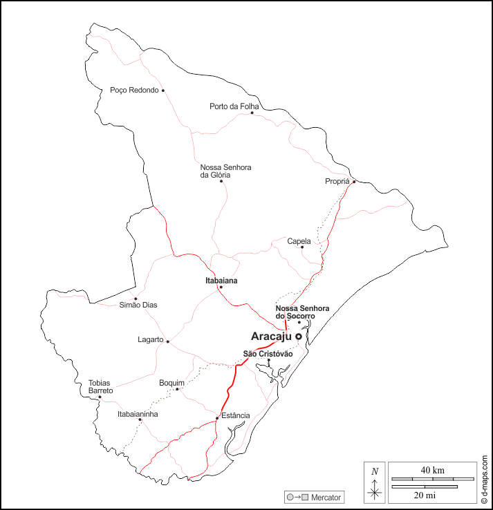 d-maps > महाअमेरिका > ब्राज़ील > सर्जिप राज्य > बाह्यरेखा, मुख्य शहरों, सड़कों, नाम, सफेद