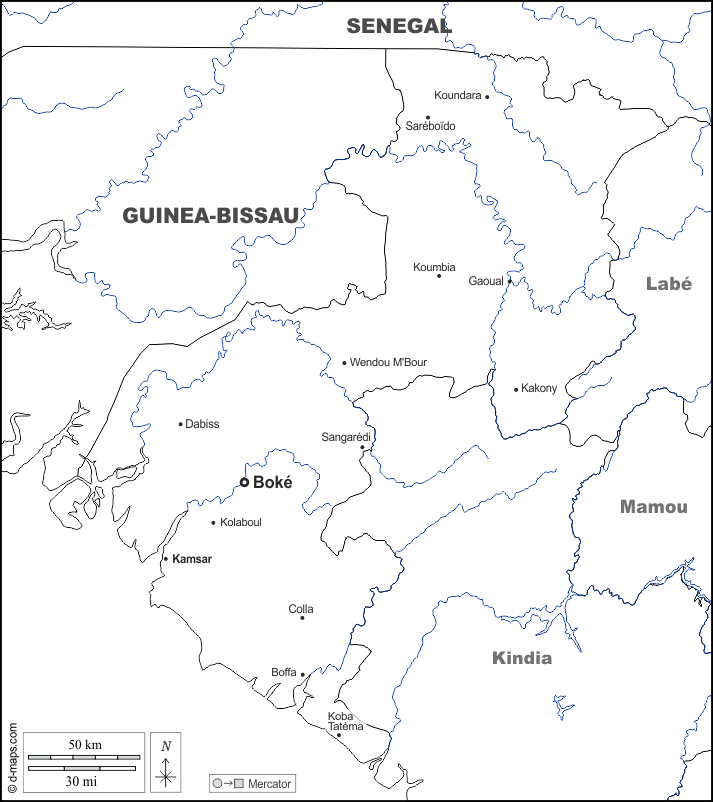 d-maps > अफ्रीका > गिनी > बोके क्षेत्र > सीमाओं, जल-सर्वेक्षण, मुख्य शहरों, नाम, सफेद