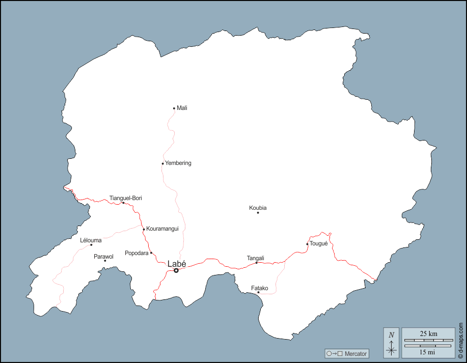d-maps > अफ्रीका > गिनी > लाबे क्षेत्र > बाह्यरेखा, मुख्य शहरों, सड़कों, नाम