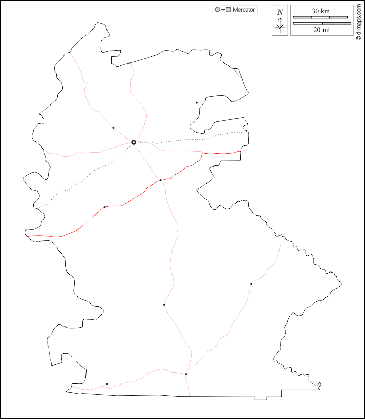 d-maps > अफ्रीका > बुर्किना फासो > नंदो > बाह्यरेखा, मुख्य शहरों, सड़कों, सफेद