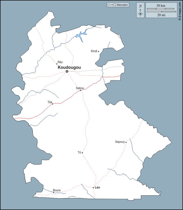d-maps > अफ्रीका > बुर्किना फासो > नंदो > बाह्यरेखा, जल-सर्वेक्षण, मुख्य शहरों, सड़कों, नाम