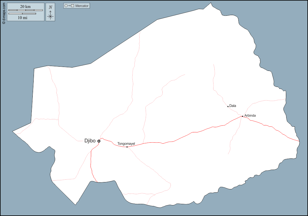 d-maps > अफ्रीका > बुर्किना फासो > उप > बाह्यरेखा, मुख्य शहरों, सड़कों, नाम