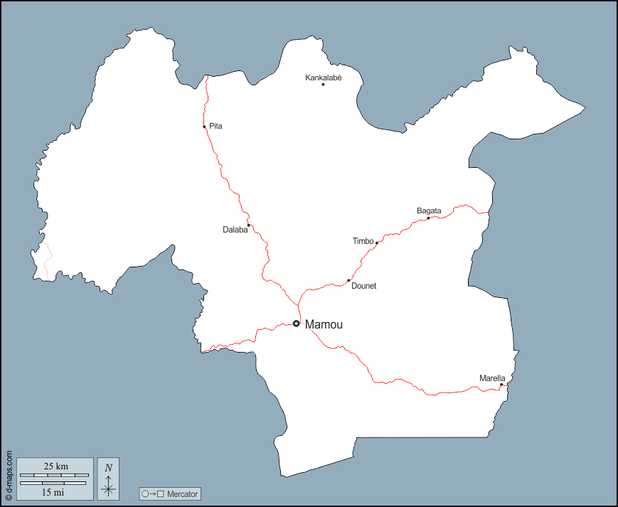 d-maps > अफ्रीका > गिनी > मामू क्षेत्र > बाह्यरेखा, मुख्य शहरों, सड़कों, नाम
