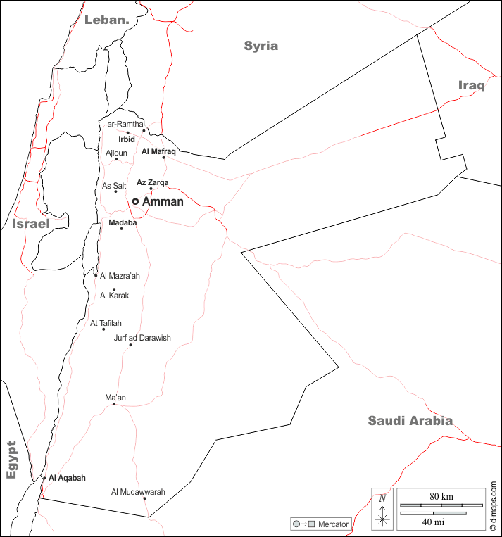 d-maps > एशिया > जॉर्डन > सीमाओं, मुख्य शहरों, सड़कों, नाम, सफेद