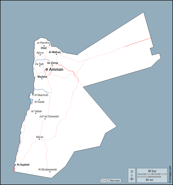 d-maps > एशिया > जॉर्डन > बाह्यरेखा, जल-सर्वेक्षण, मुख्य शहरों, सड़कों, नाम