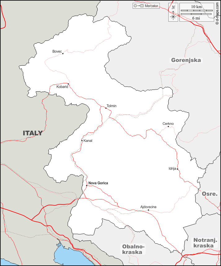 d-maps > यूरोप > स्लोवेनिया > गोरिज़िया > सीमाओं, मुख्य शहरों, सड़कों, नाम
