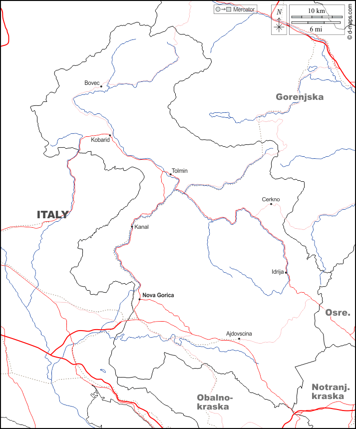 d-maps > यूरोप > स्लोवेनिया > गोरिज़िया > सीमाओं, जल-सर्वेक्षण, मुख्य शहरों, सड़कों, नाम, सफेद