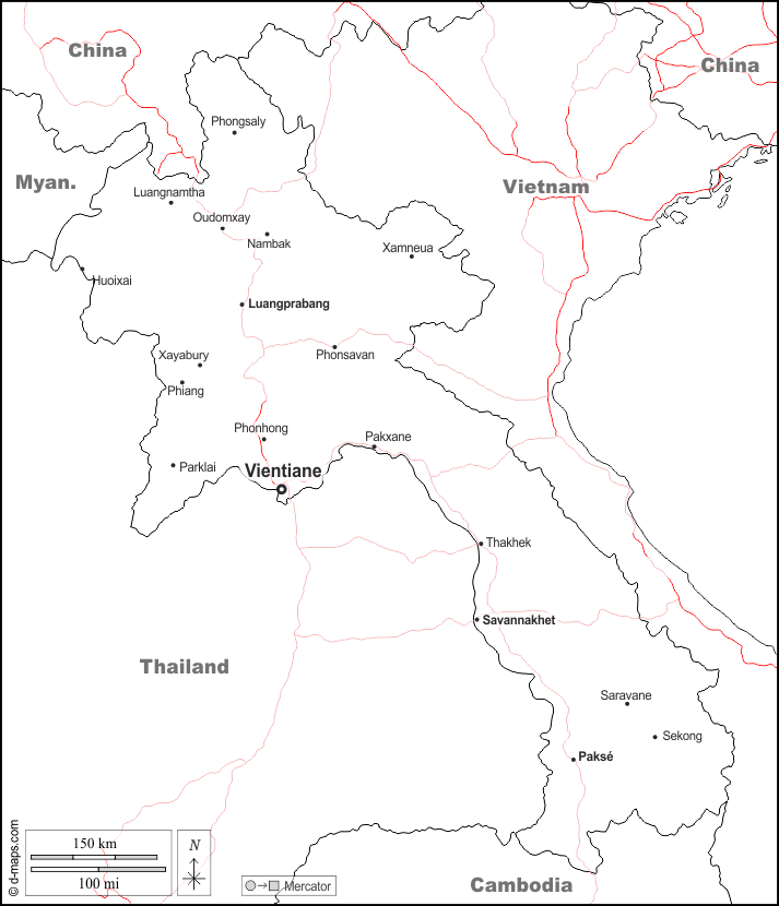 d-maps > एशिया > लाओस > सीमाओं, मुख्य शहरों, सड़कों, नाम, सफेद