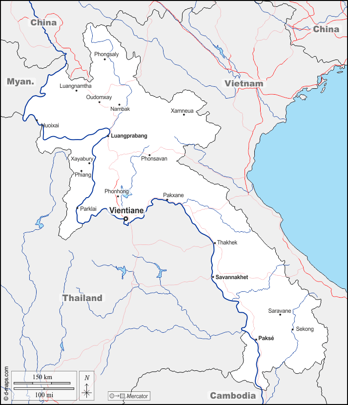 d-maps > एशिया > लाओस > सीमाओं, जल-सर्वेक्षण, मुख्य शहरों, सड़कों, नाम