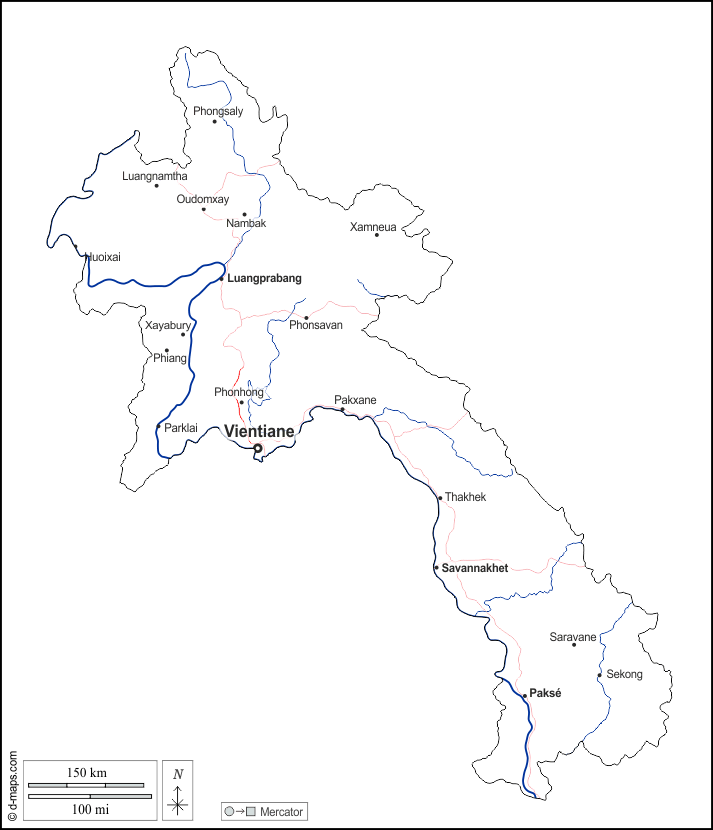 d-maps > एशिया > लाओस > बाह्यरेखा, जल-सर्वेक्षण, मुख्य शहरों, सड़कों, नाम, सफेद