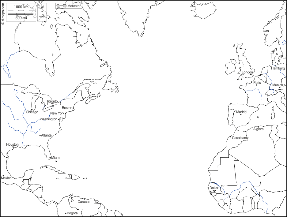 d-maps > दुनिया और महासागरों > उत्तरी अटलांटिक महासागर > जल-सर्वेक्षण, राज्यों, मुख्य शहरों, नाम, सफेद