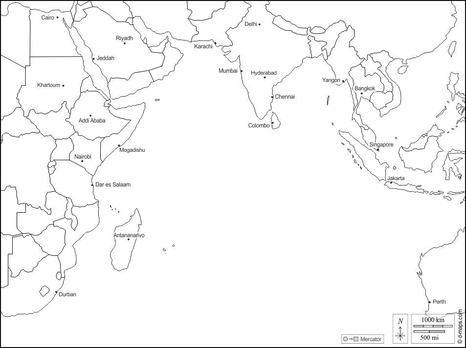 d-maps > दुनिया और महासागरों > हिंद महासागर > राज्यों, मुख्य शहरों, नाम, सफेद