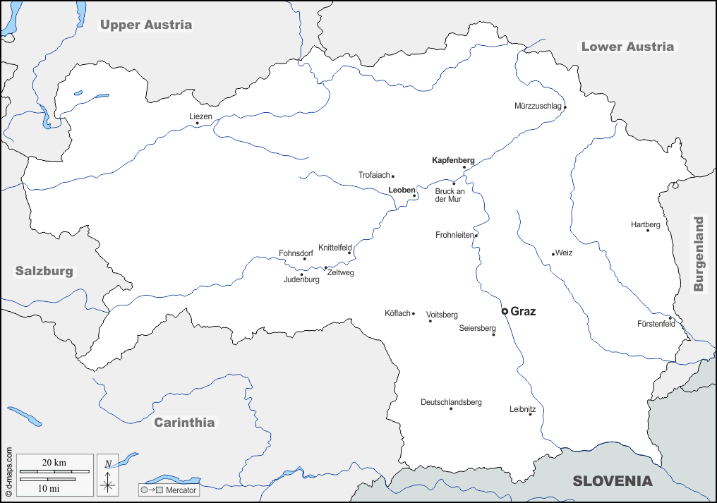 d-maps > यूरोप > ऑस्ट्रिया > स्टायरिया > सीमाओं, जल-सर्वेक्षण, मुख्य शहरों, नाम