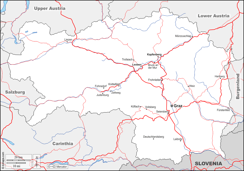 d-maps > यूरोप > ऑस्ट्रिया > स्टायरिया > सीमाओं, जल-सर्वेक्षण, मुख्य शहरों, सड़कों, नाम