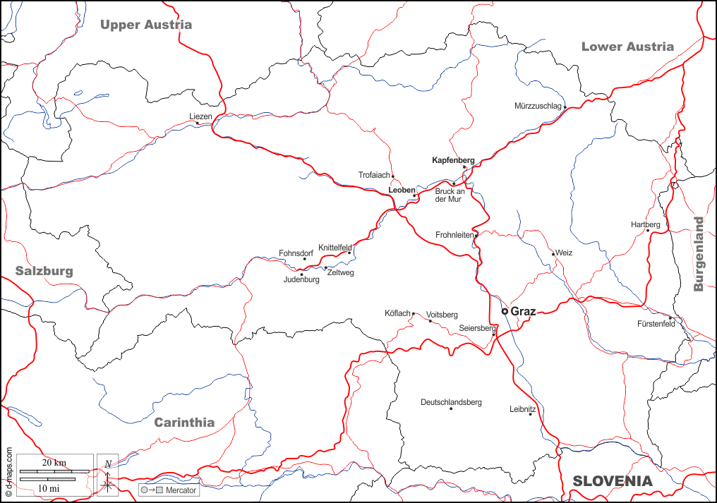 d-maps > यूरोप > ऑस्ट्रिया > स्टायरिया > सीमाओं, जल-सर्वेक्षण, मुख्य शहरों, सड़कों, नाम, सफेद
