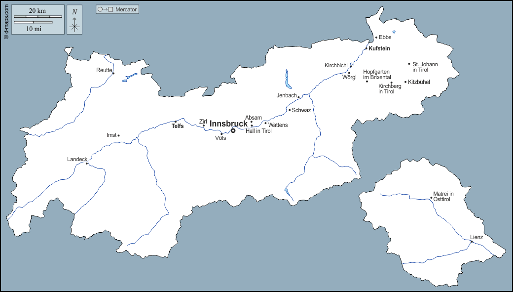 d-maps > यूरोप > ऑस्ट्रिया > टायरोल > बाह्यरेखा, जल-सर्वेक्षण, मुख्य शहरों, नाम