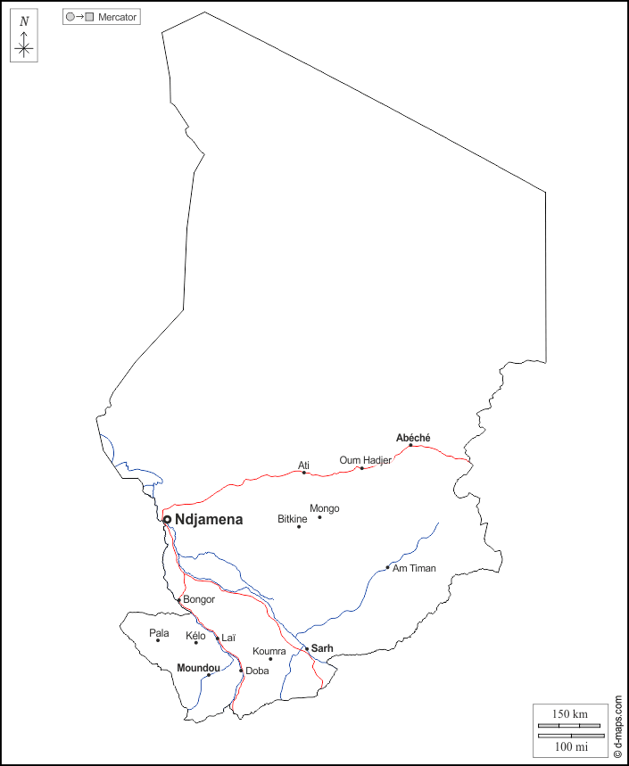 d-maps > अफ्रीका > चाड > चाड > बाह्यरेखा, जल-सर्वेक्षण, मुख्य शहरों, सड़कों, नाम, सफेद