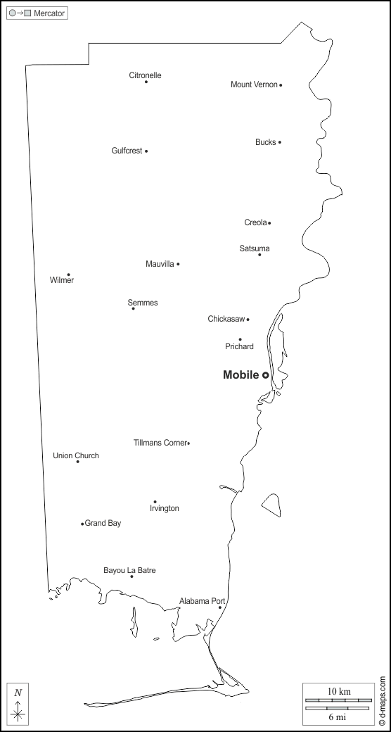d-maps > संयुक्त राज्य > अलबामा > मोबाइल काउंटी > बाह्यरेखा, मुख्य शहरों, नाम, सफेद