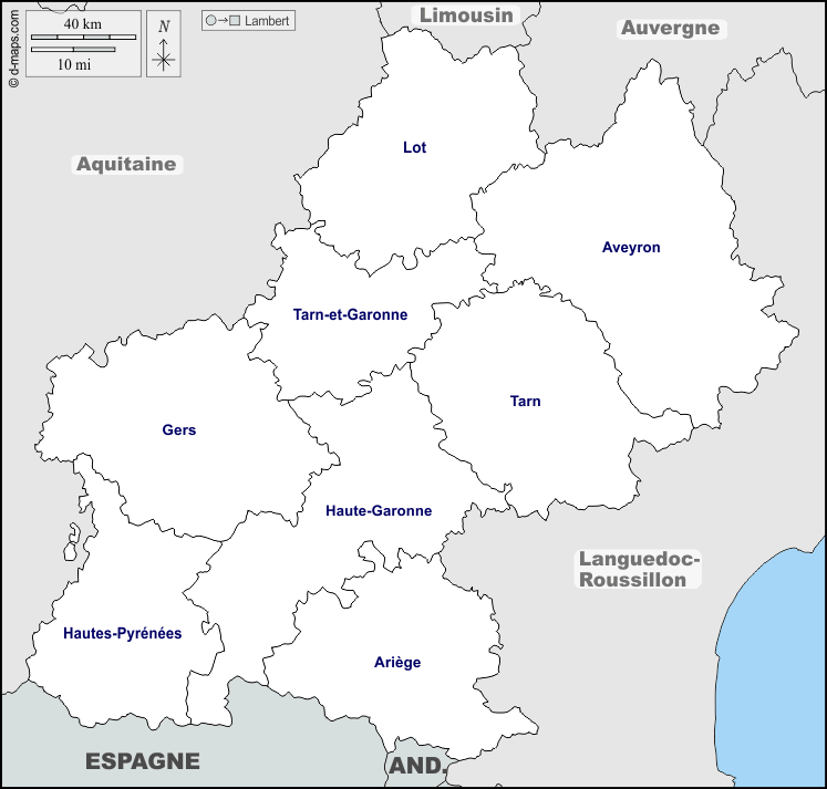 d-maps > यूरोप > फ़्रान्स > मिडी-पिरेनीज़ > सीमाओं, विभागों, नाम