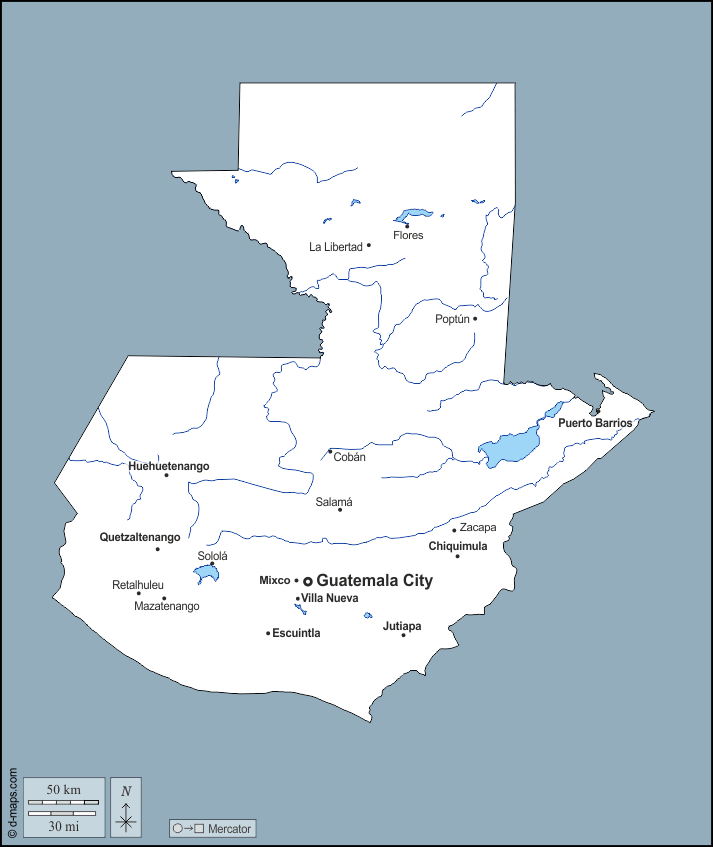 d-maps > महाअमेरिका > ग्वाटेमाला > बाह्यरेखा, जल-सर्वेक्षण, मुख्य शहरों, नाम
