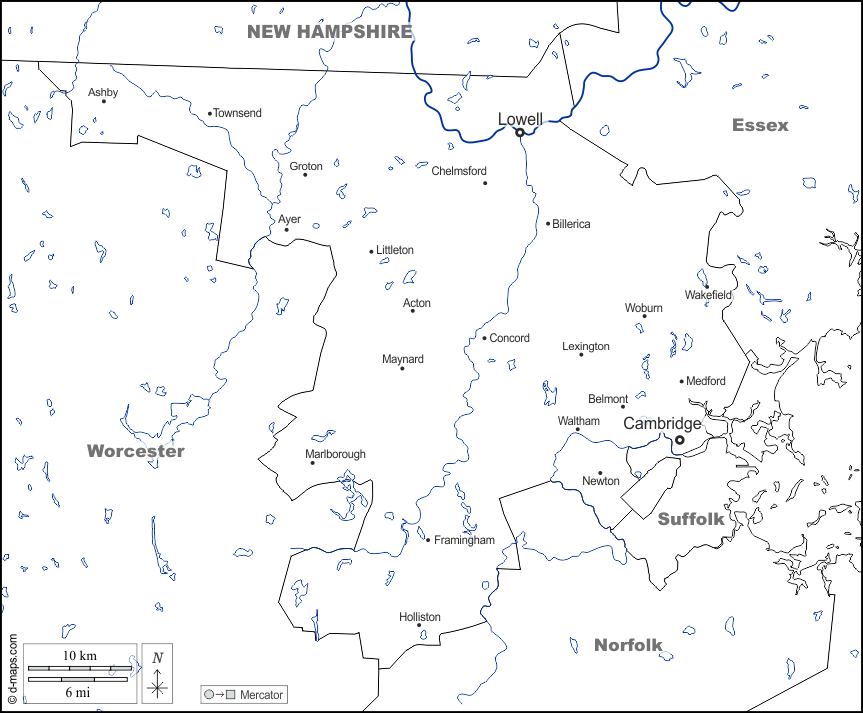d-maps > संयुक्त राज्य > मैसाचुसेट्स > मिडलसेक्स काउंटी > सीमाओं, जल-सर्वेक्षण, मुख्य शहरों, नाम, सफेद
