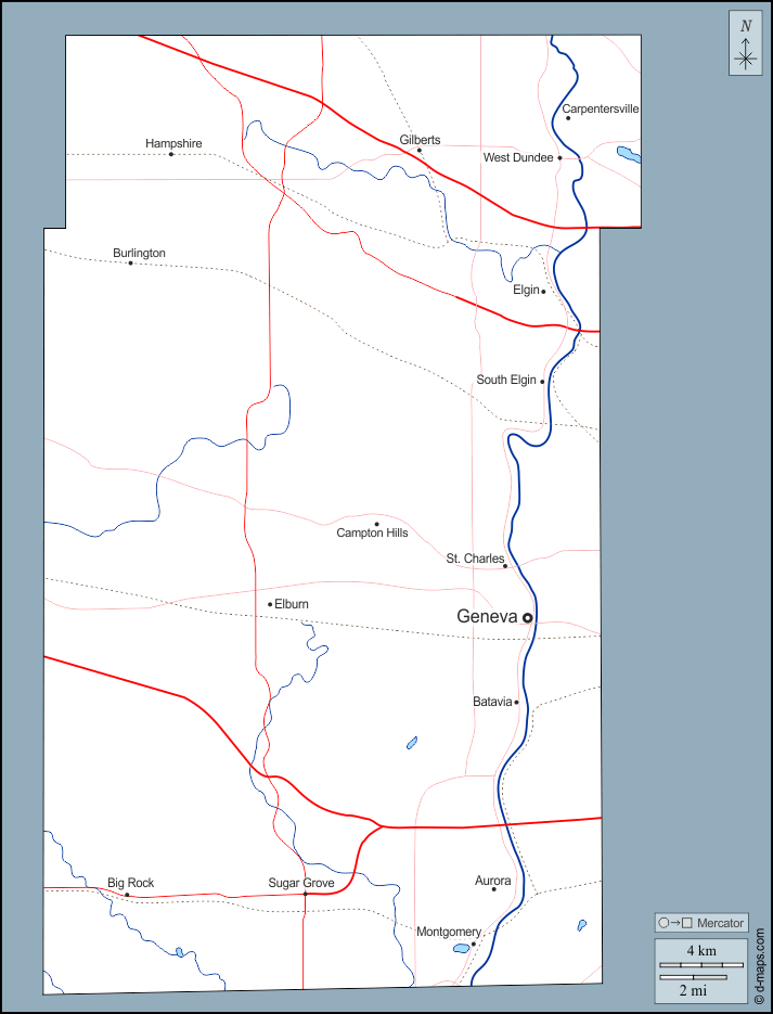 d-maps > संयुक्त राज्य > इलिनॉय > केन काउंटी > बाह्यरेखा, जल-सर्वेक्षण, मुख्य शहरों, सड़कों, नाम