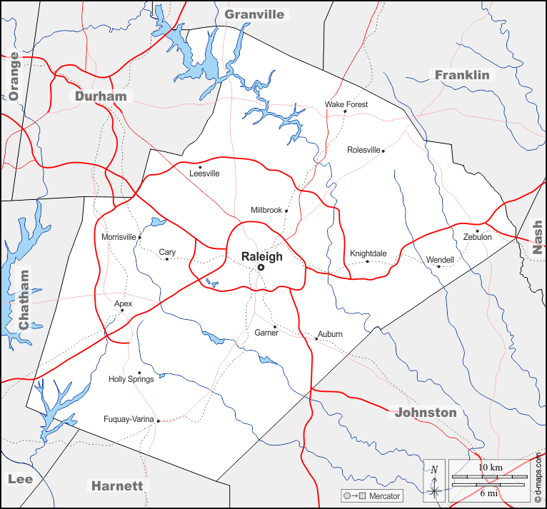 d-maps > संयुक्त राज्य > नॉर्थ कैरोलिना > वेक काउंटी > सीमाओं, जल-सर्वेक्षण, पड़ोस, सड़कों, नाम