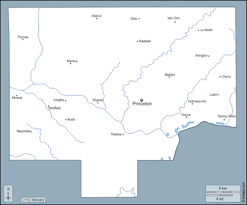 d-maps > संयुक्त राज्य > इलिनॉय > ब्यूरो काउंटी > बाह्यरेखा, जल-सर्वेक्षण, मुख्य शहरों, नाम