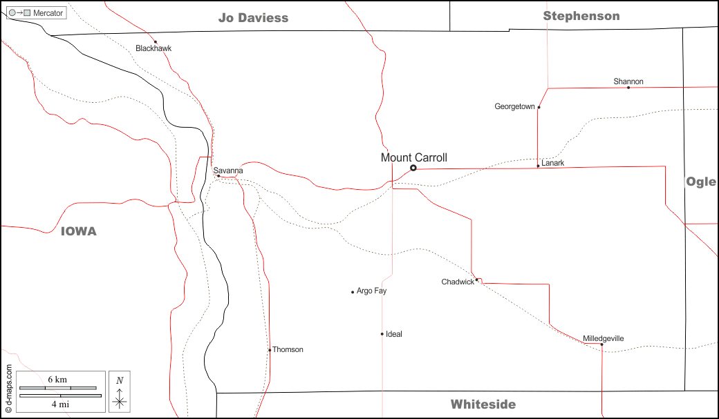 d-maps > संयुक्त राज्य > इलिनॉय > कैरोल काउंटी > सीमाओं, मुख्य शहरों, सड़कों, नाम, सफेद