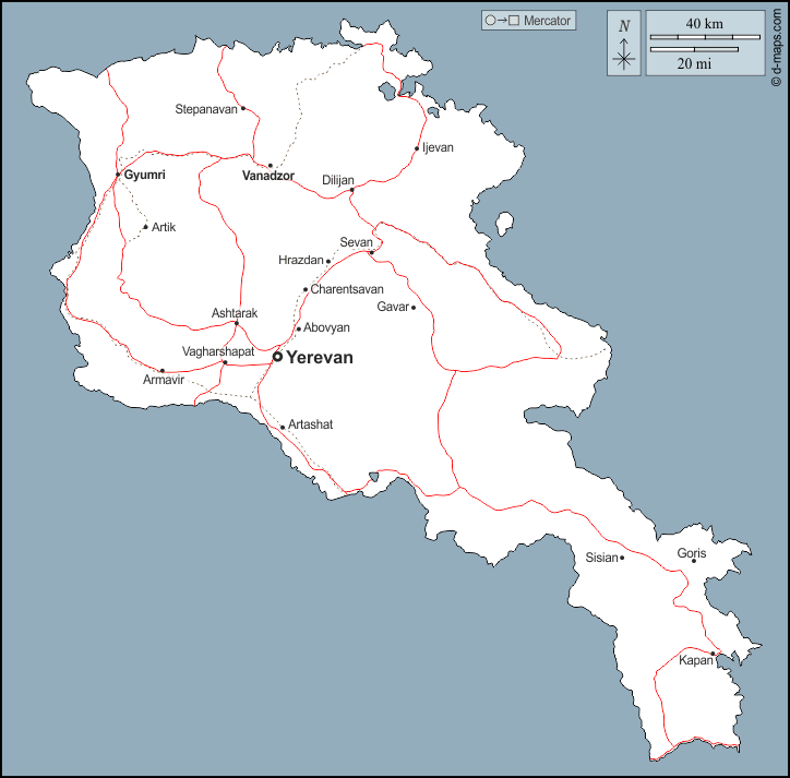d-maps > एशिया > आर्मीनिया > बाह्यरेखा, मुख्य शहरों, सड़कों, नाम