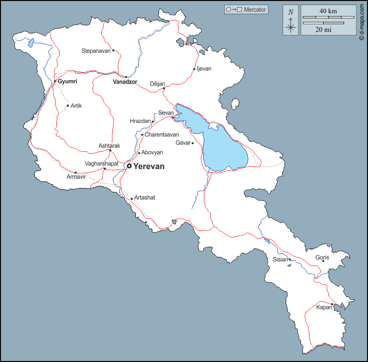 d-maps > एशिया > आर्मीनिया > बाह्यरेखा, जल-सर्वेक्षण, मुख्य शहरों, सड़कों, नाम
