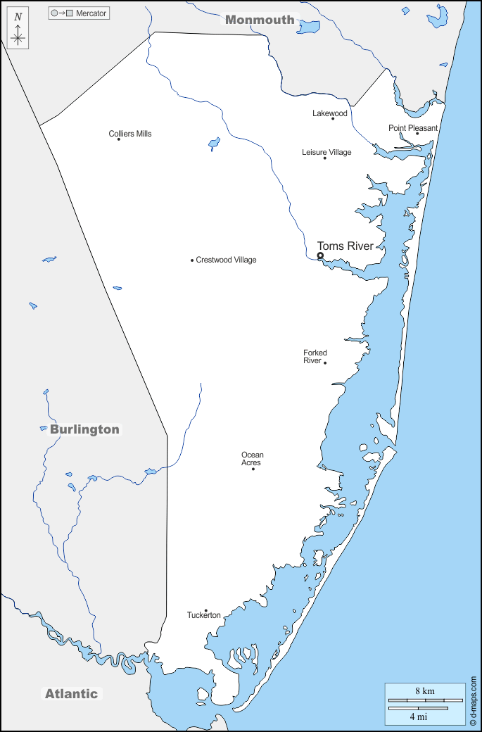 d-maps > संयुक्त राज्य > न्यू जर्सी > महासागर काउंटी > सीमाओं, जल-सर्वेक्षण, मुख्य शहरों, नाम