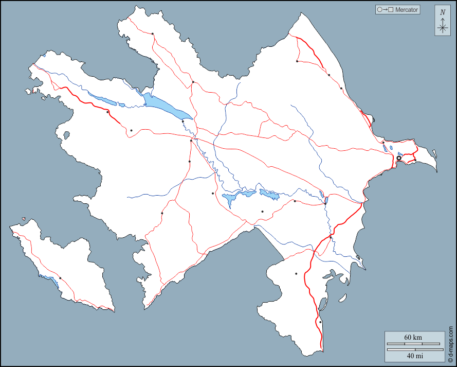 d-maps > एशिया > अज़रबैजान > बाह्यरेखा, जल-सर्वेक्षण, मुख्य शहरों, सड़कों