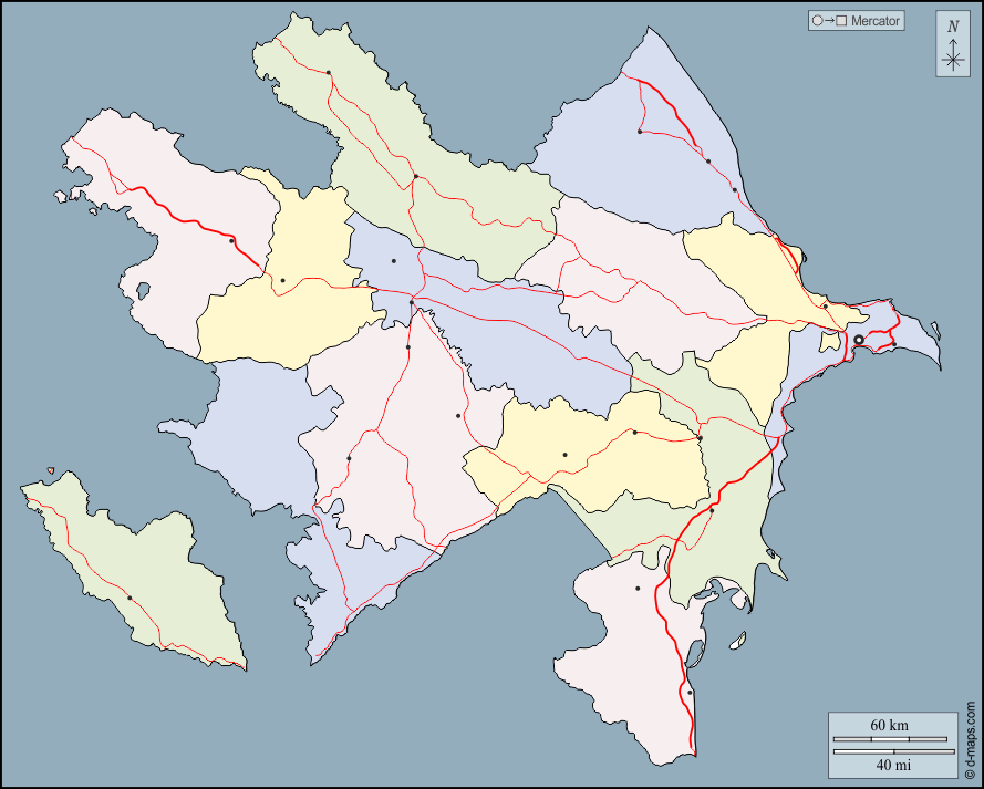 d-maps > एशिया > अज़रबैजान > बाह्यरेखा, क्षेत्रों, मुख्य शहरों, सड़कों, रंग