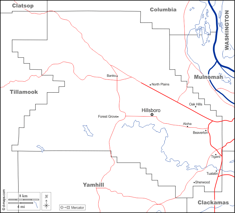 d-maps > संयुक्त राज्य > औरिगन > वाशिंगटन काउंटी > सीमाओं, जल-सर्वेक्षण, मुख्य शहरों, सड़कों, नाम, सफेद