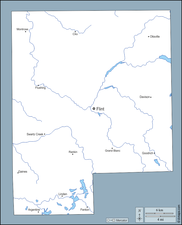 d-maps > संयुक्त राज्य > मिशिगन > जेनेसी काउंटी > बाह्यरेखा, जल-सर्वेक्षण, मुख्य शहरों, नाम