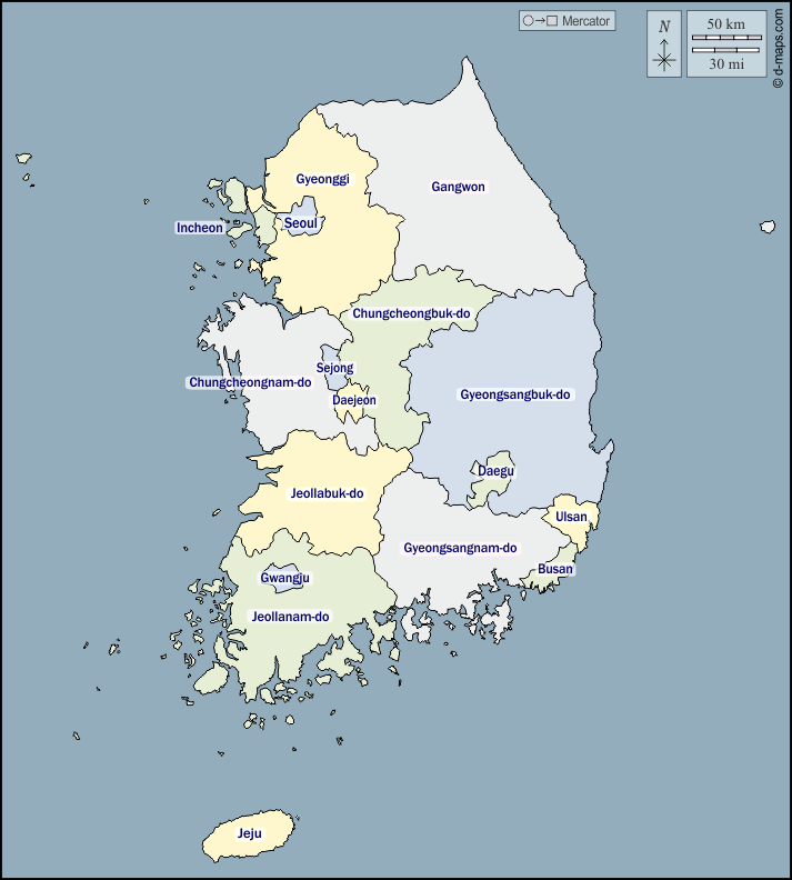 d-maps > एशिया > दक्षिण कोरिया > दक्षिण कोरिया > बाह्यरेखा, प्रांतों, नाम, रंग