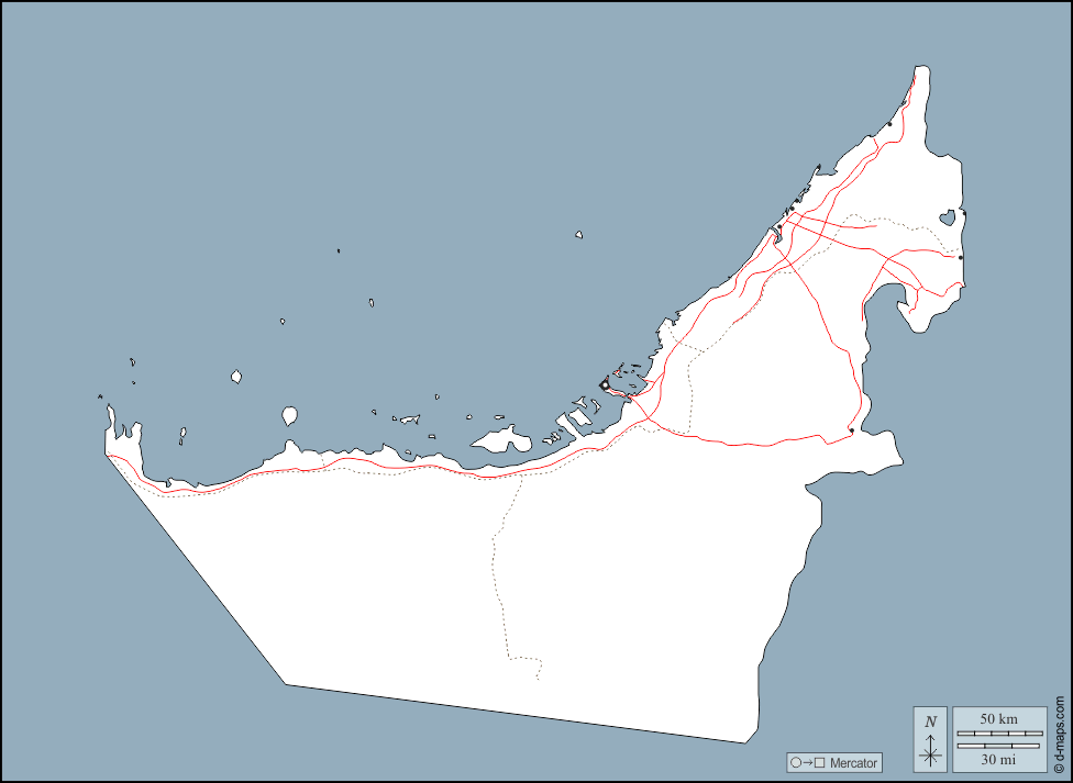 d-maps > एशिया > संयुक्त अरब अमीरात > बाह्यरेखा, मुख्य शहरों, सड़कों
