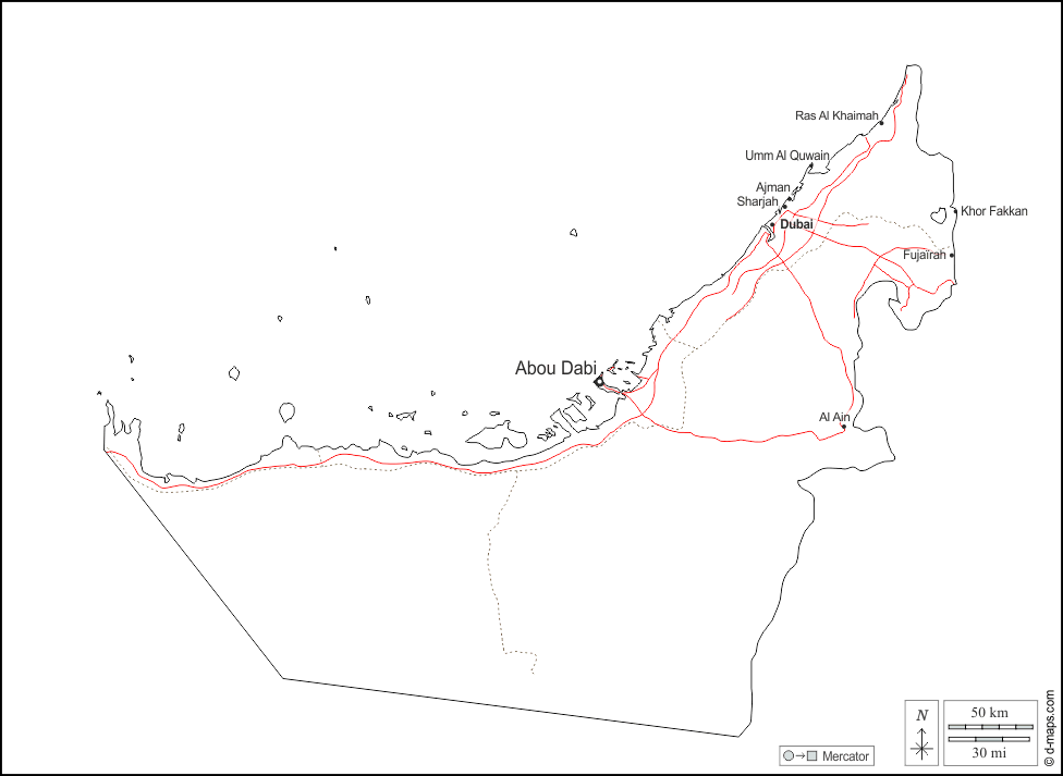 d-maps > एशिया > संयुक्त अरब अमीरात > बाह्यरेखा, मुख्य शहरों, सड़कों, नाम, सफेद