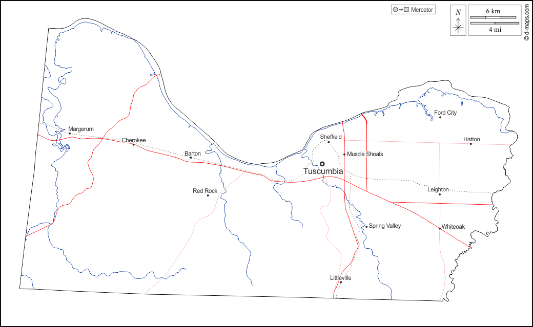 d-maps > संयुक्त राज्य > अलबामा > कोलबर्ट काउंटी > बाह्यरेखा, जल-सर्वेक्षण, मुख्य शहरों, सड़कों, नाम, सफेद