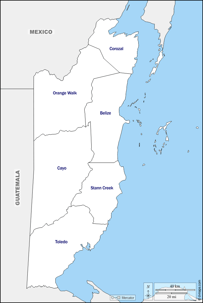 d-maps > महाअमेरिका > बेलीज़ > सीमाओं, जिलों, नाम