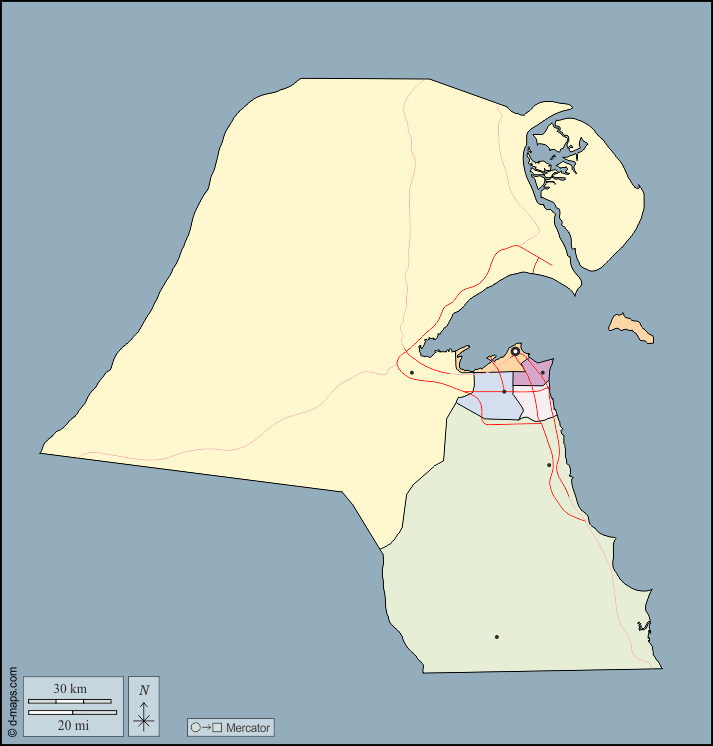 d-maps > एशिया > कुवैत > बाह्यरेखा, प्रशासनिक, मुख्य शहरों, सड़कों, रंग