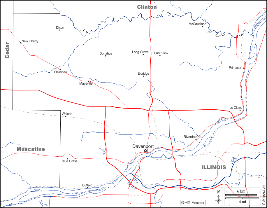 d-maps > संयुक्त राज्य > आयोवा > स्कॉट काउंटी > सीमाओं, जल-सर्वेक्षण, मुख्य शहरों, सड़कों, नाम, सफेद