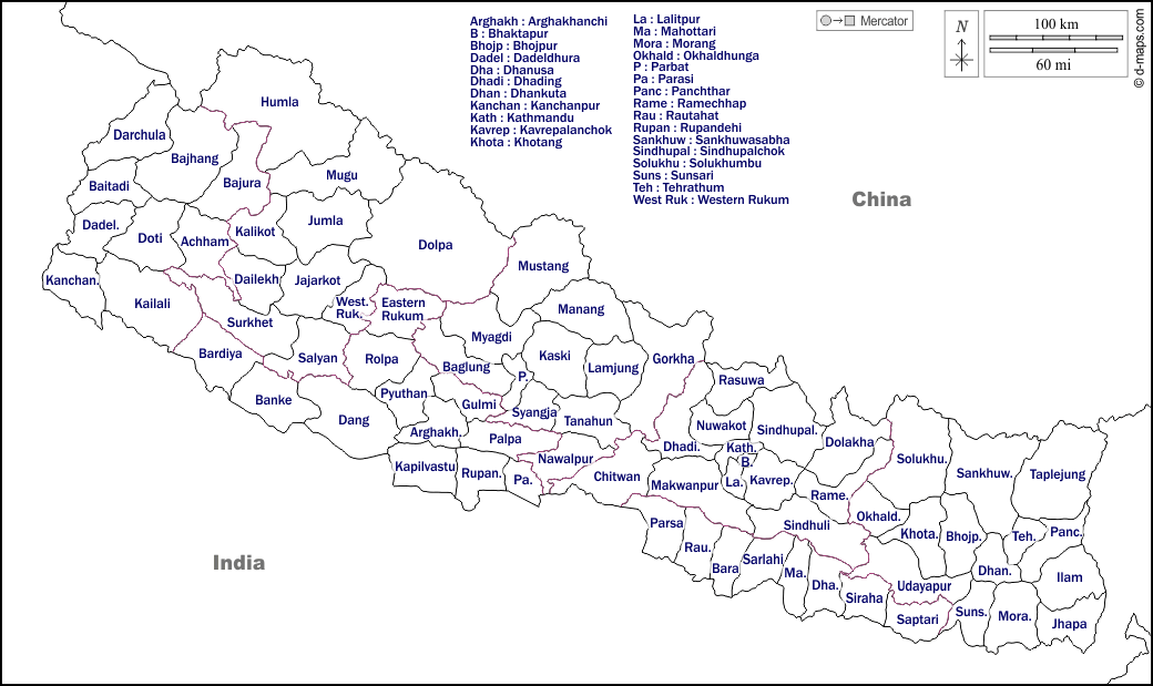 d-maps > एशिया > नेपाल > सीमाओं, जिलों, नाम, सफेद