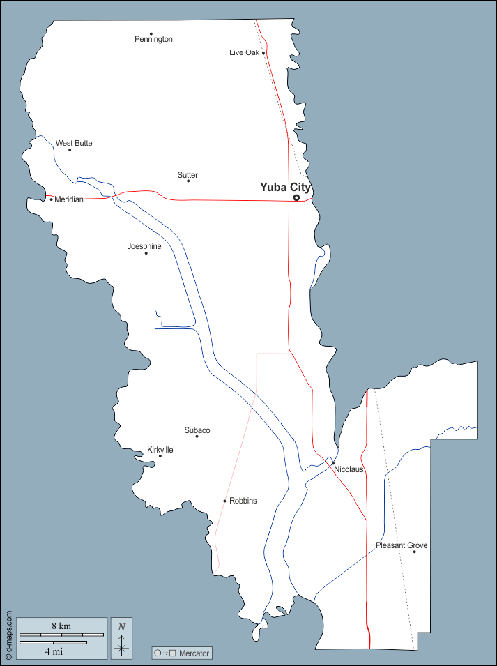 d-maps > संयुक्त राज्य > कैलिफोर्निया > सुटर काउंटी > बाह्यरेखा, जल-सर्वेक्षण, मुख्य शहरों, सड़कों, नाम