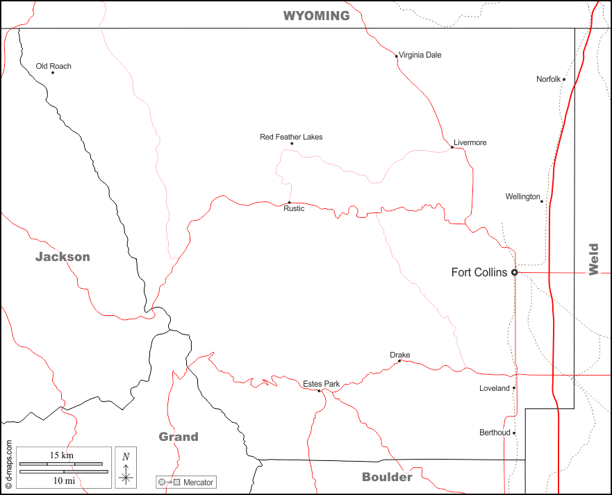 d-maps > संयुक्त राज्य > कोलोराडो > लैरिमेर काउंटी > सीमाओं, मुख्य शहरों, सड़कों, नाम, सफेद