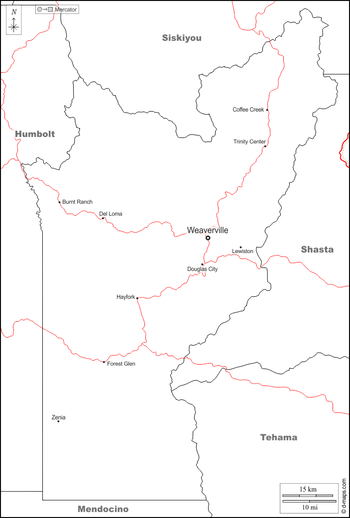 d-maps > संयुक्त राज्य > कैलिफोर्निया > ट्रिनिटी काउंटी > सीमाओं, मुख्य शहरों, सड़कों, नाम, सफेद