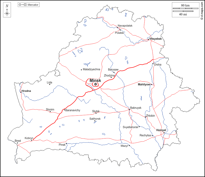 d-maps > यूरोप > बेलारूस > बेलारूस > बाह्यरेखा, जल-सर्वेक्षण, मुख्य शहरों, सड़कों, नाम, सफेद