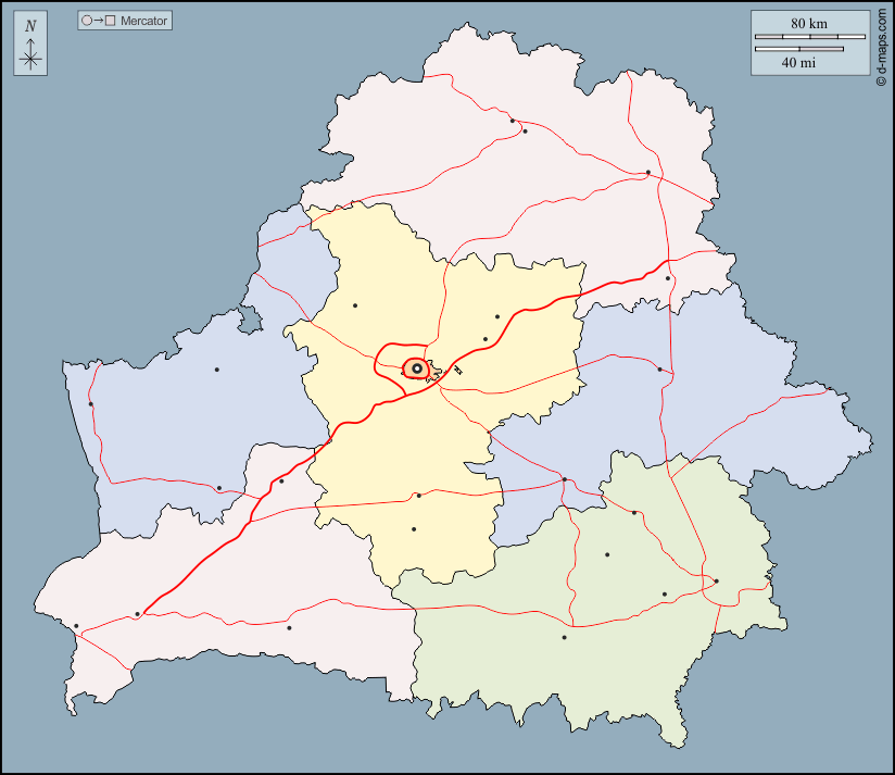 d-maps > यूरोप > बेलारूस > बेलारूस > बाह्यरेखा, क्षेत्रों, मुख्य शहरों, सड़कों, रंग
